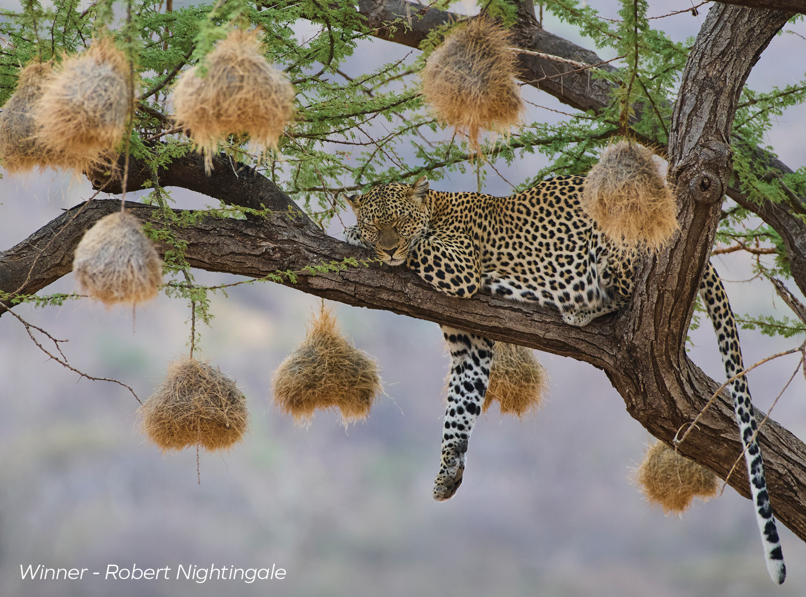 We went to Kenya to see and photograph the “big five”. We spent a week in the Masai Mara seeing everything but leopards. On our last day in Samburu as we were leaving, we fortunately saw this regal leopard sleeping in a tree far away, nestled amongst weaver nests.